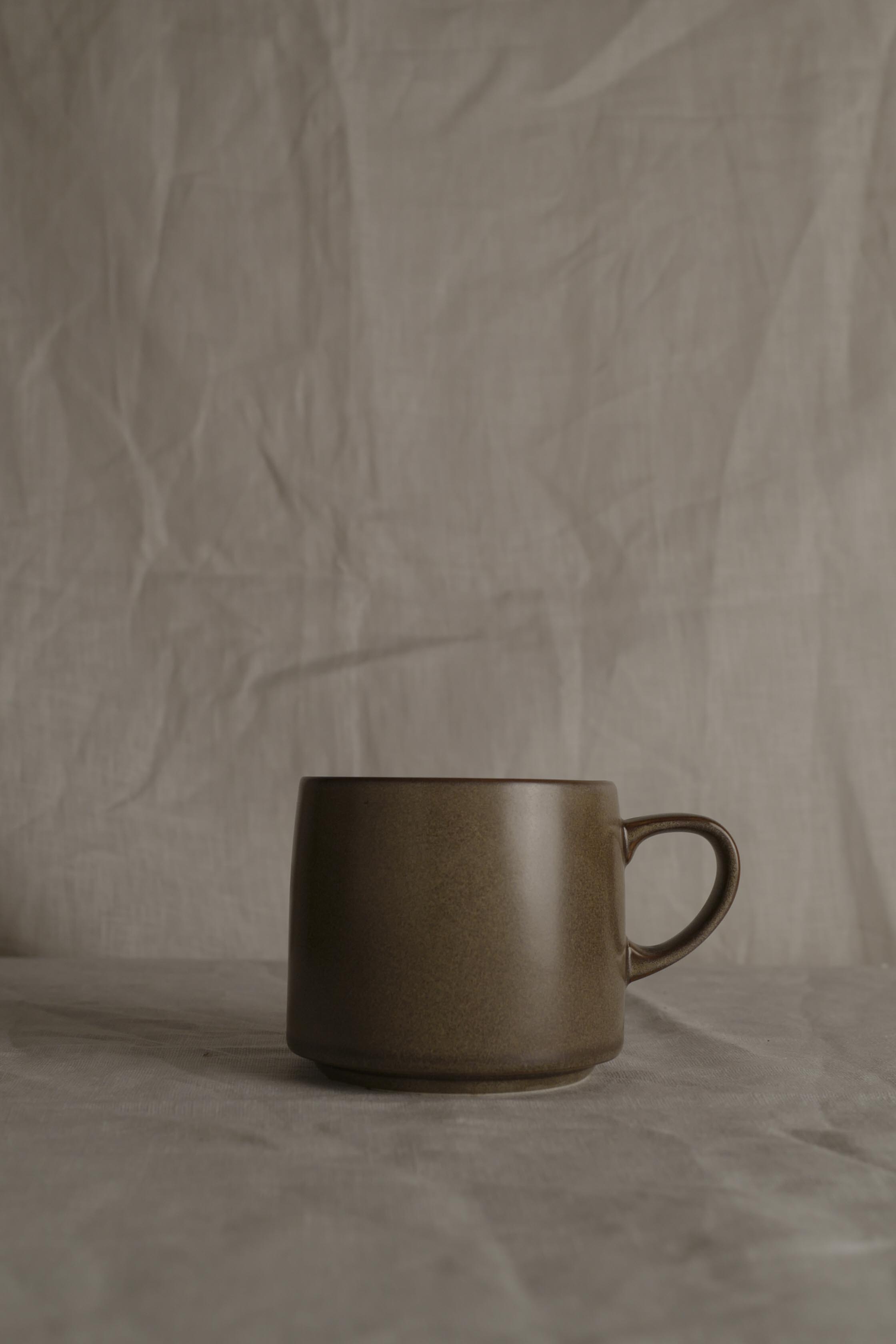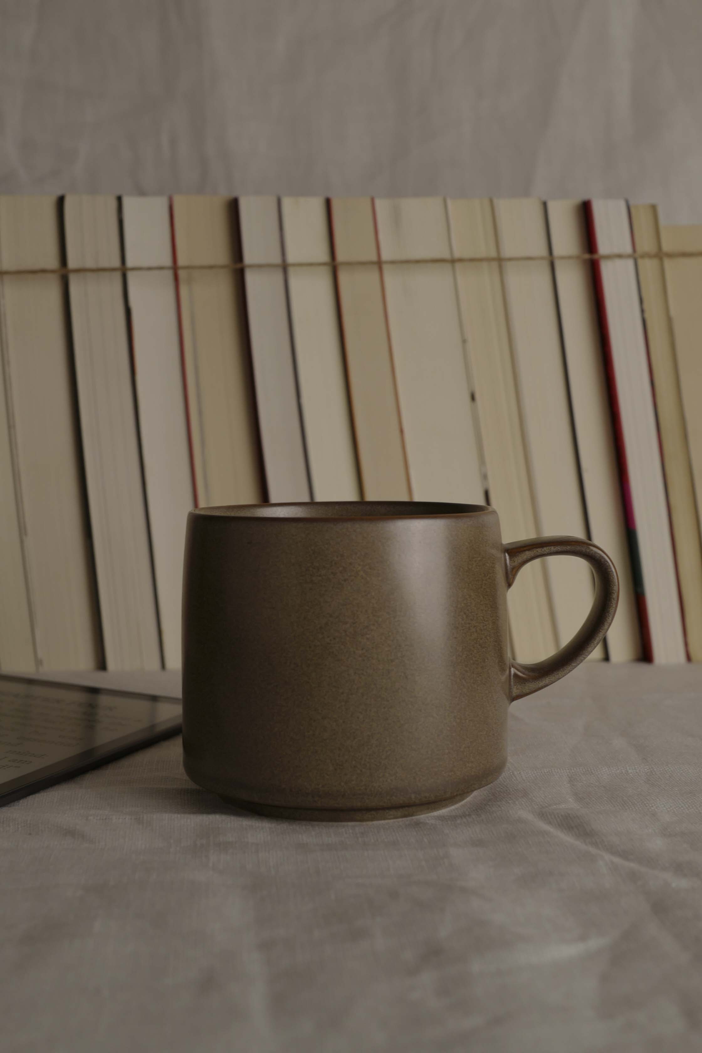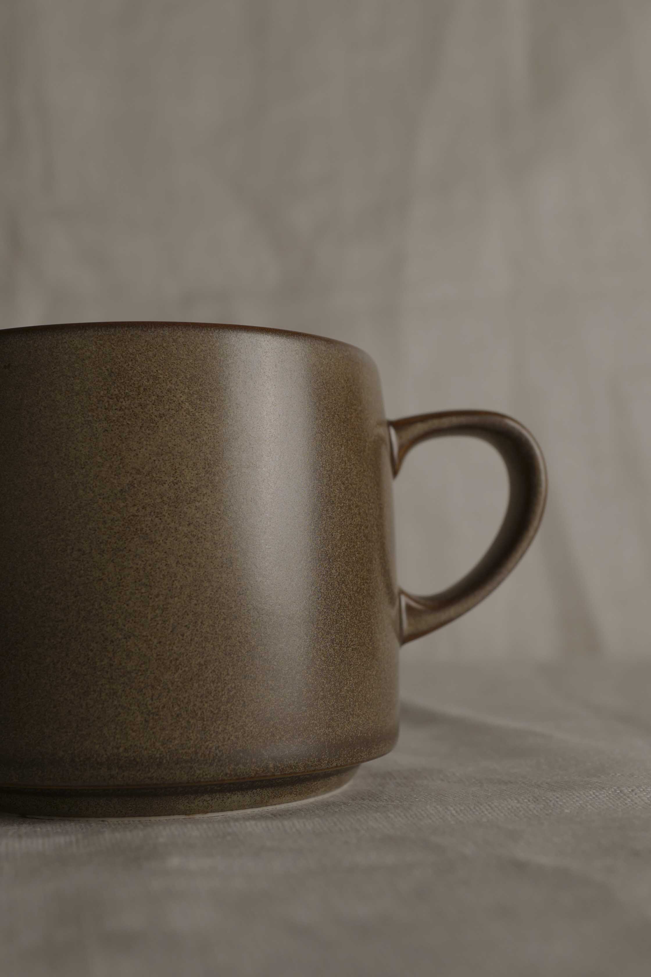 440 ml in capacity, 9 cm height, dishwasher-safe. Brown color glaze with dark-edged detailing. Created through a secondary firing process.