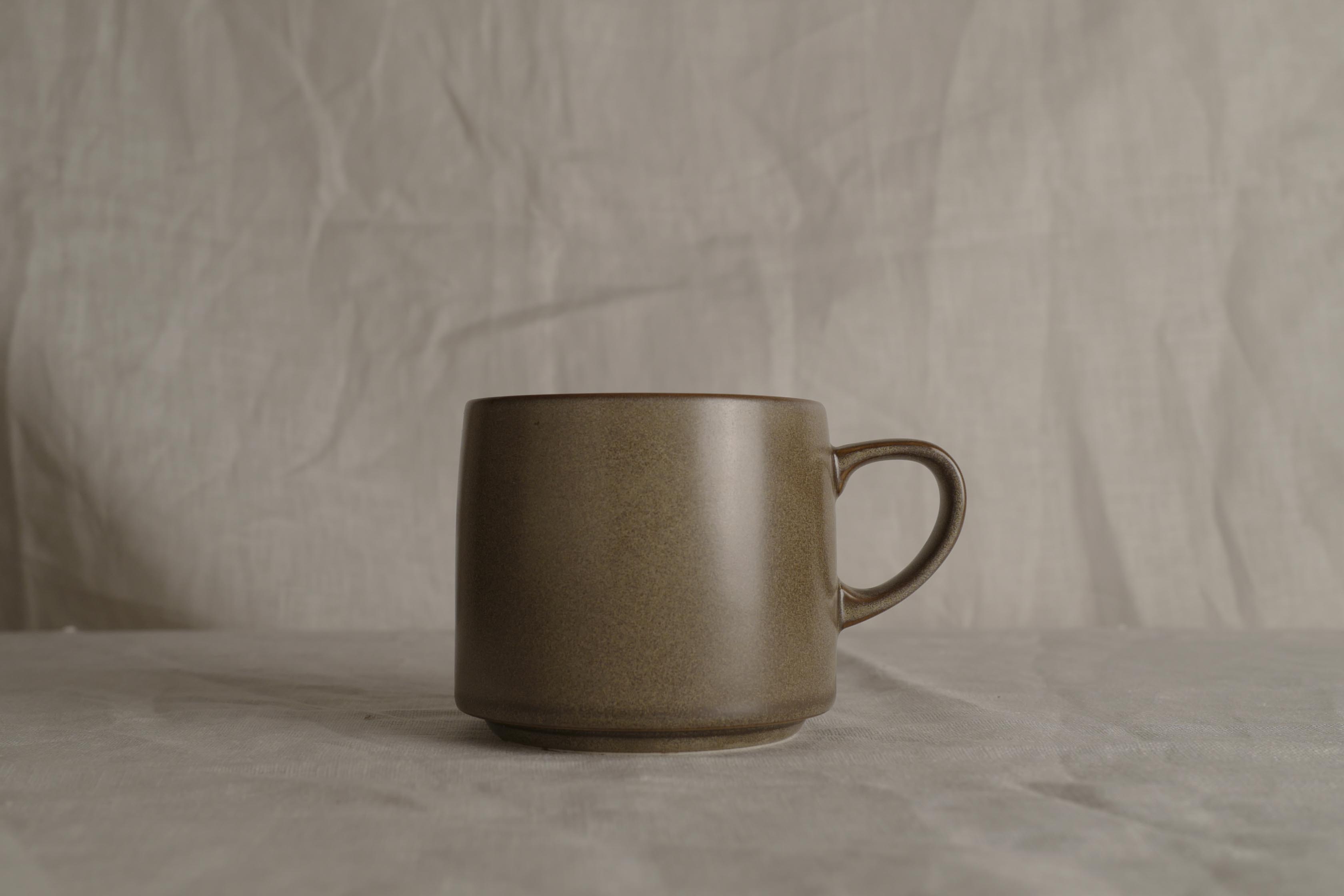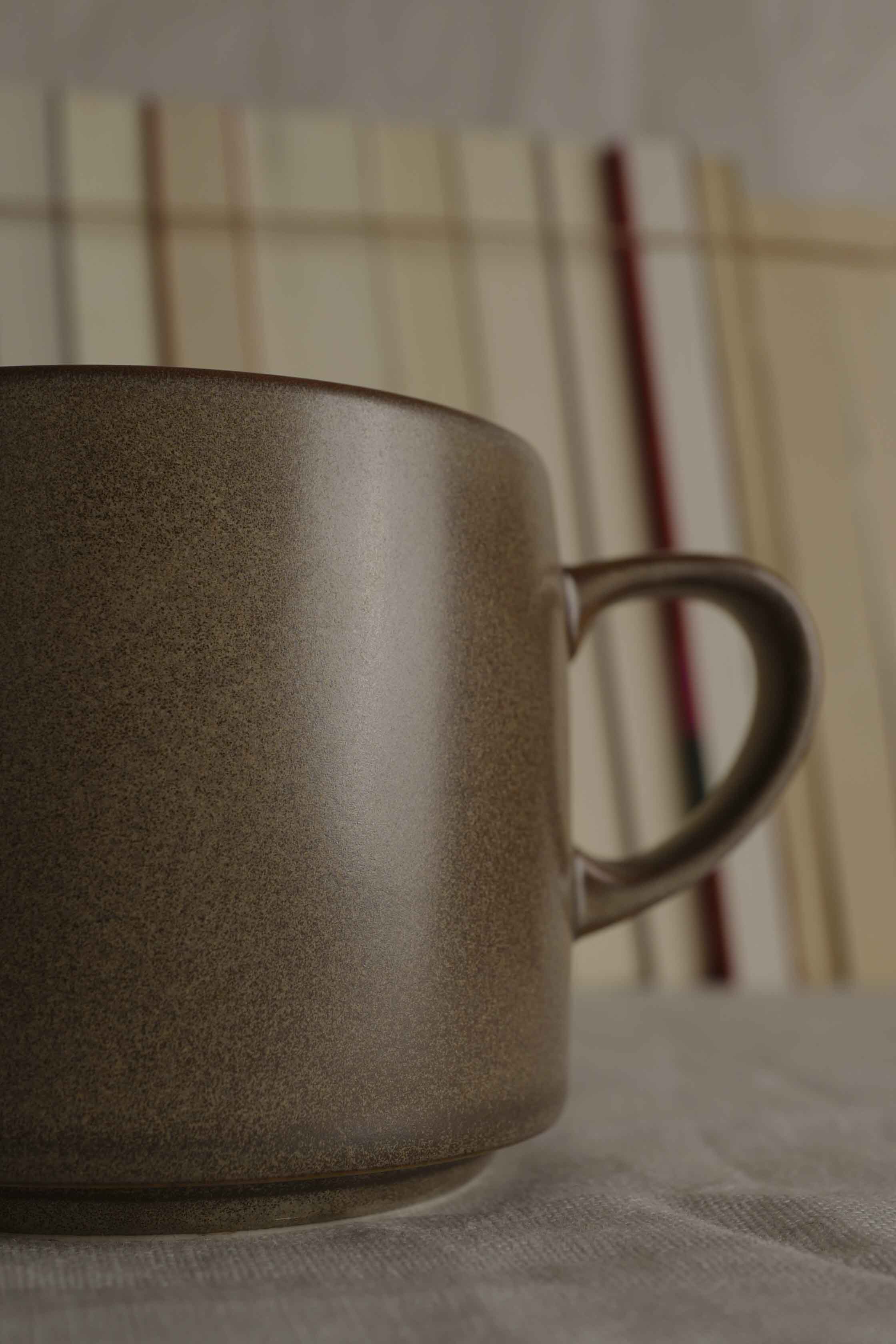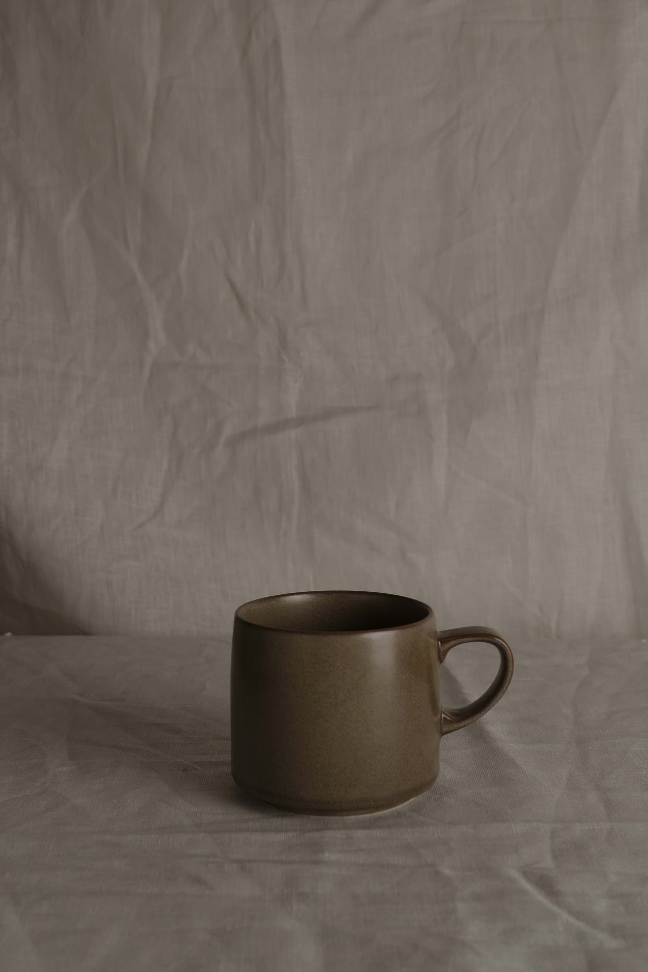 440 ml in capacity, 9 cm height, dishwasher-safe. Brown color glaze with dark-edged detailing. Created through a secondary firing process.