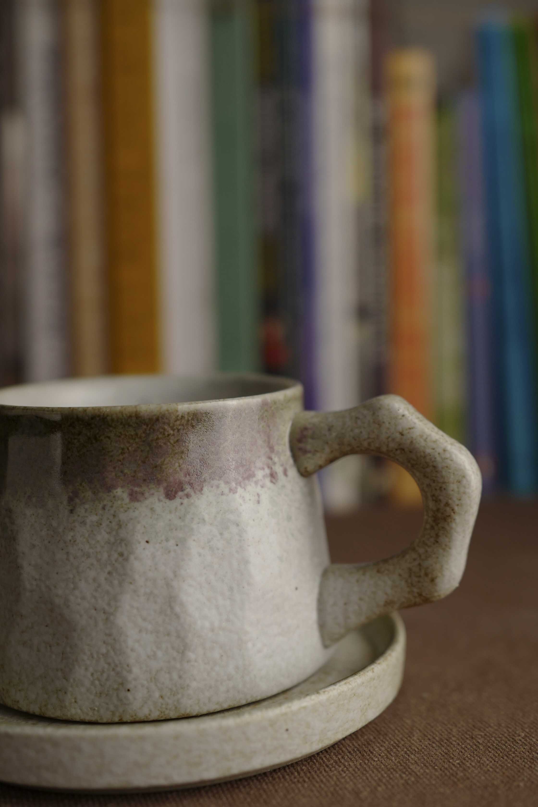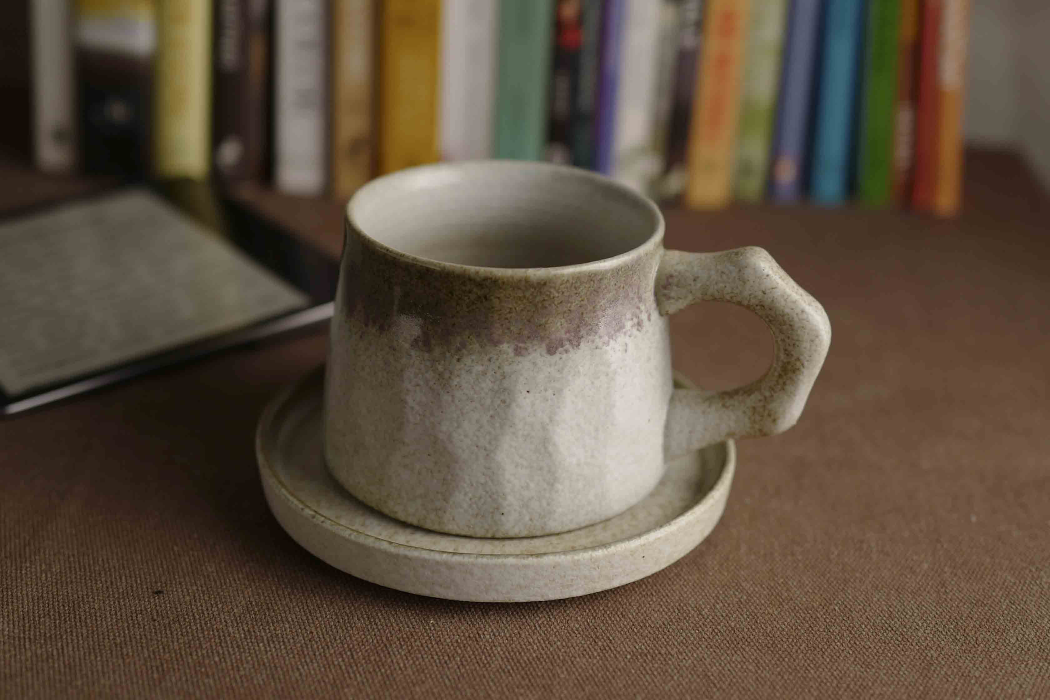 310 ml in size, 8.5cm height, dishwasher-safe. Amazing stoneware textured glaze with special smudged brown to purple glaze - magical reactions produced by the temperature changes in the kiln during firing. The irregular hexagon shape and silky surface.