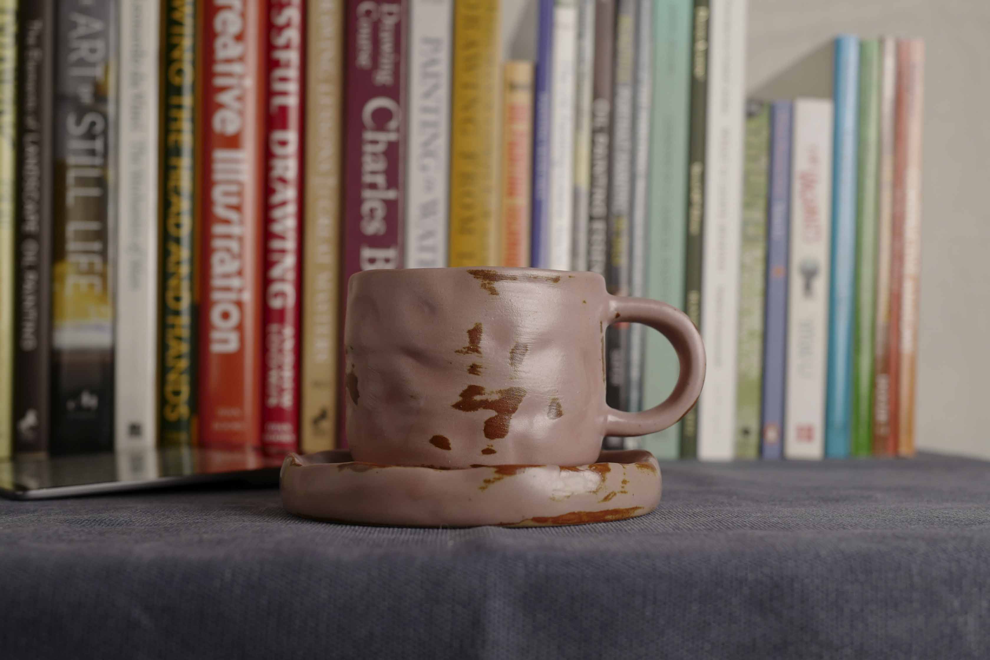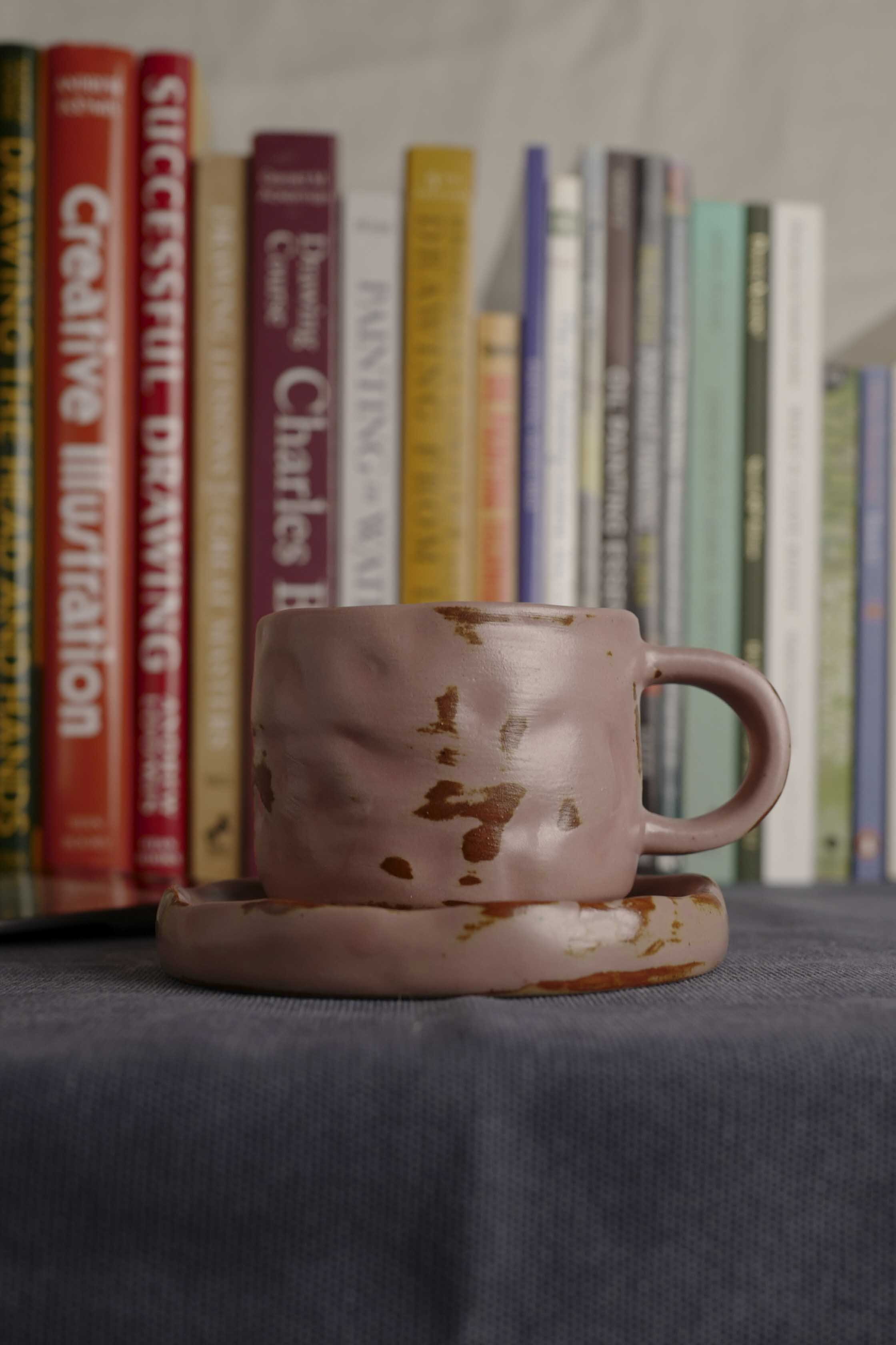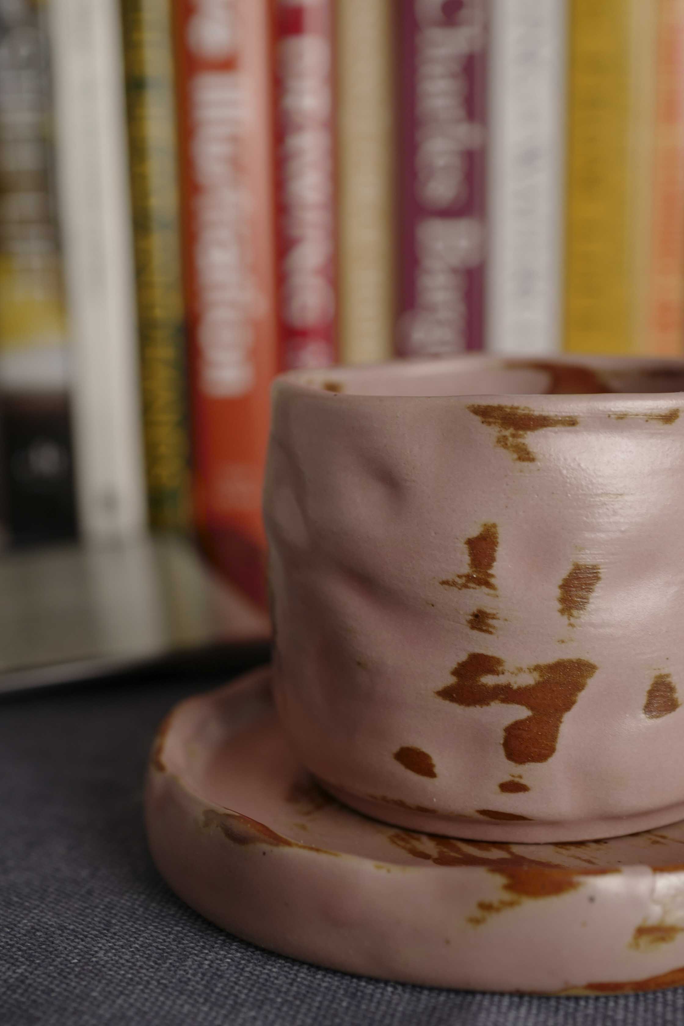 270 ml in size, with saucer 9cm in height, dishwasher-safe. Color Pink. Stoneware texture with an irregular curvy and silky surface.