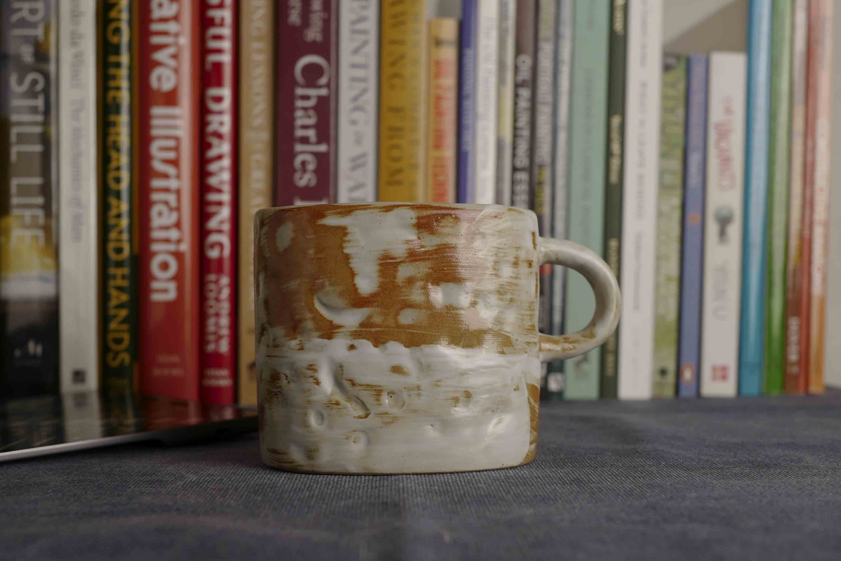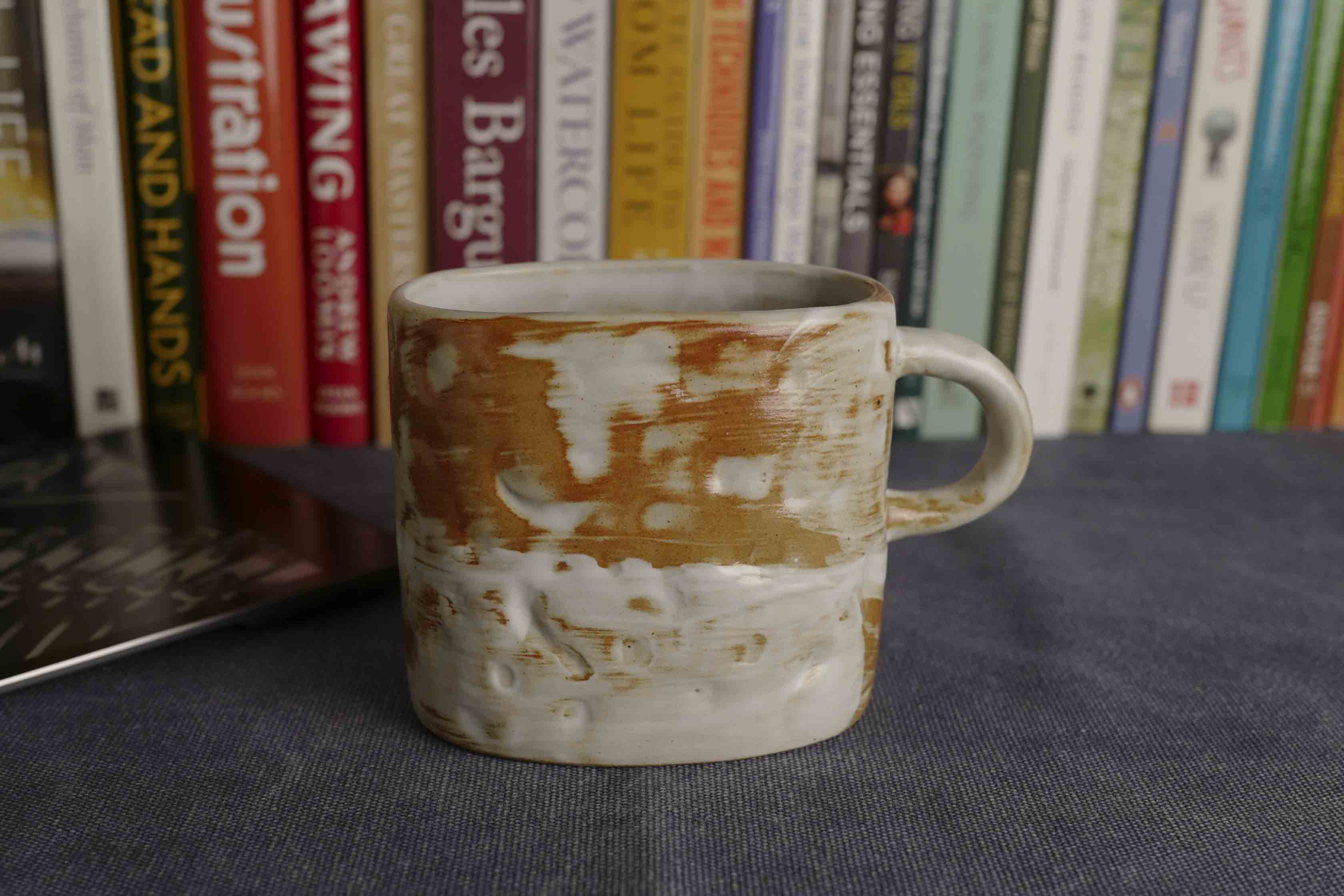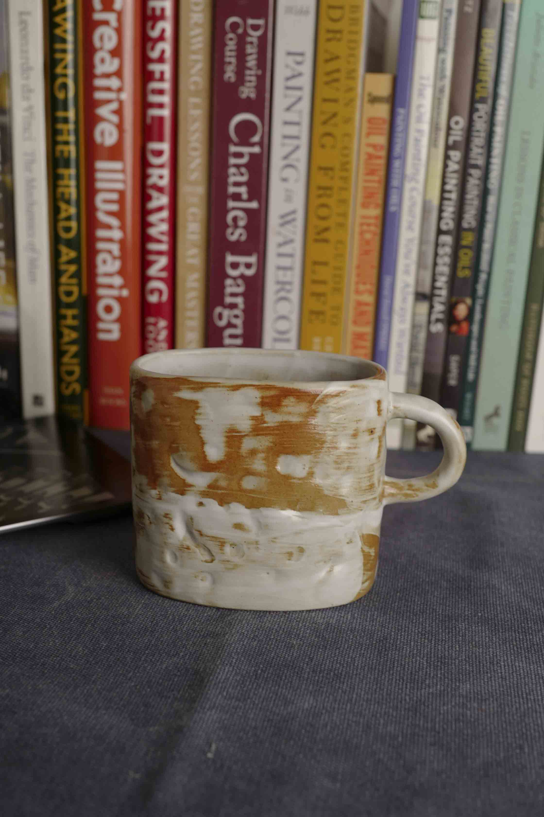 350 ml in size, 9.2 cm in height, vintage-style oval cylindrical mug. Dishwasher-safe. Color Caramel and Cream. Stoneware texture with an irregular but silky surface.