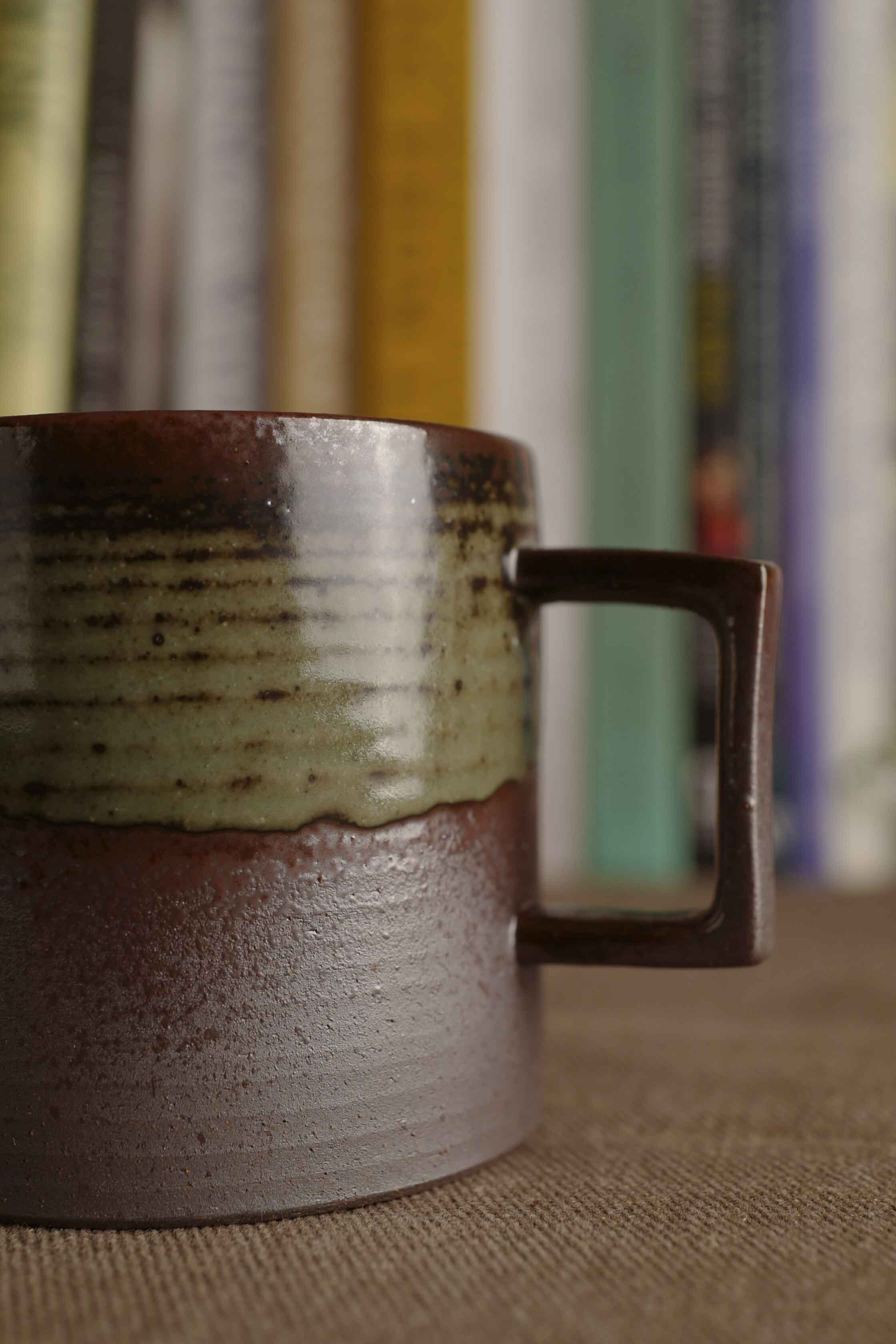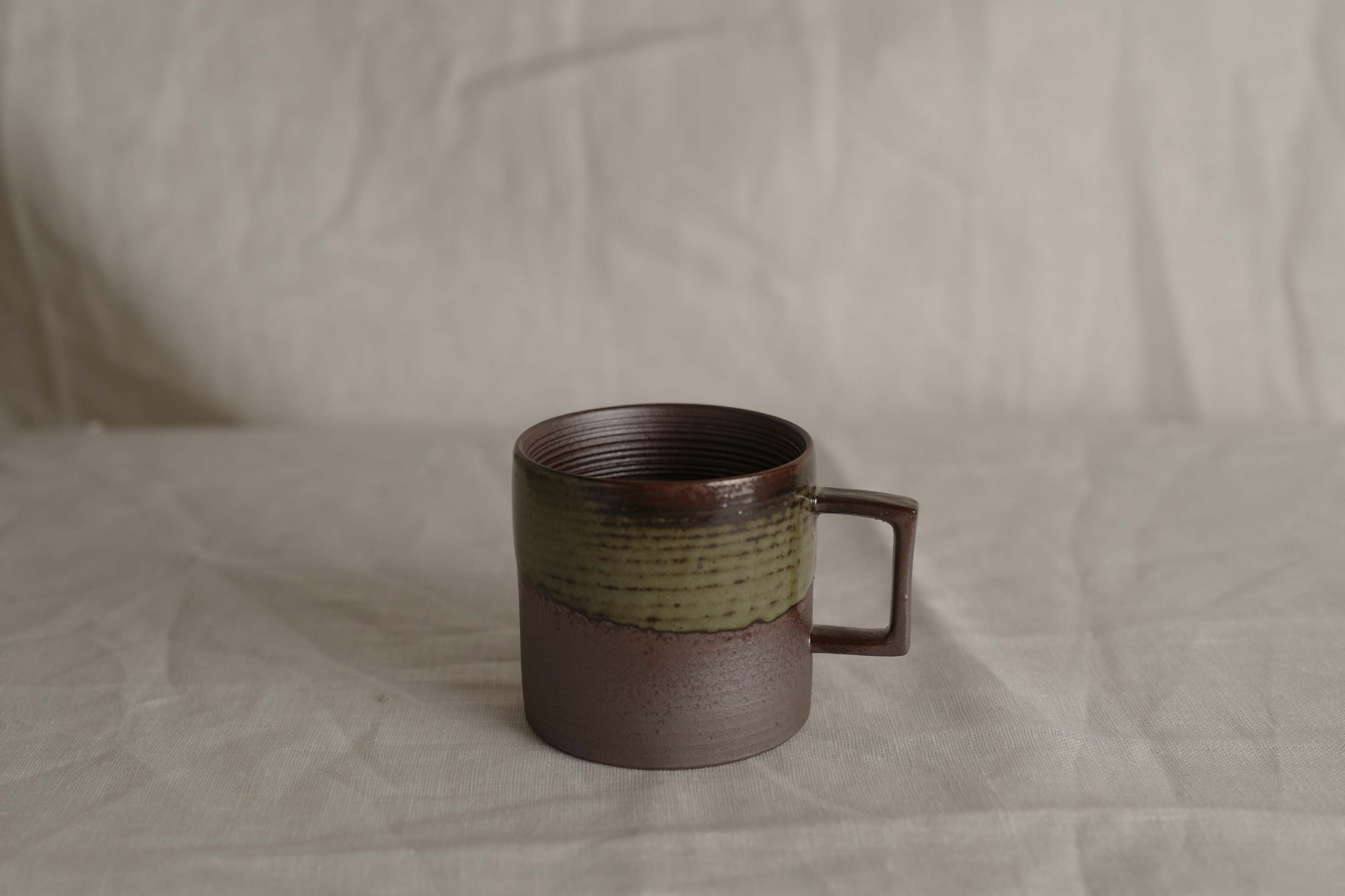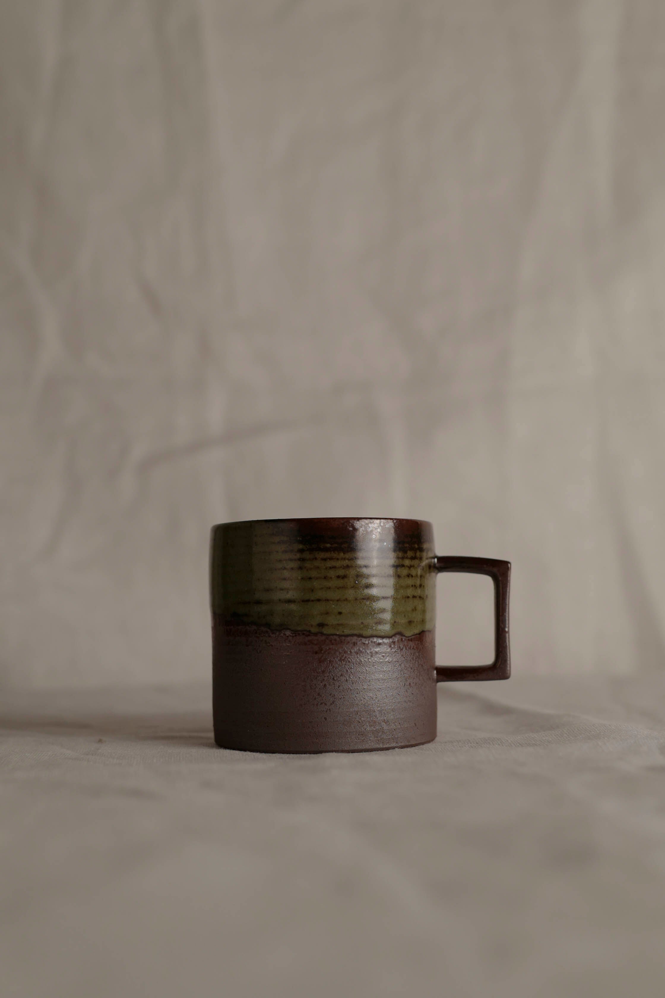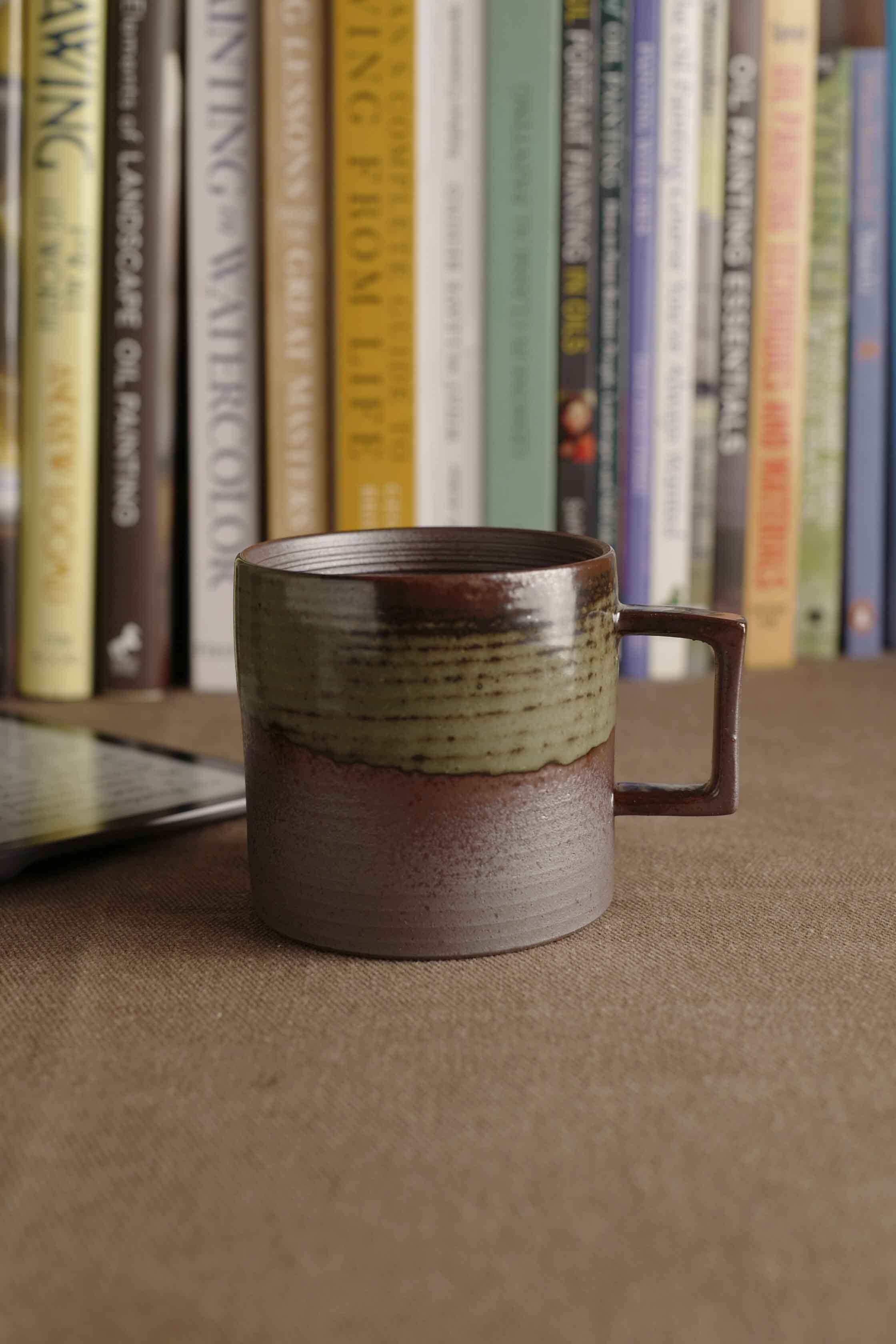 Handmade with love by Wabi-Sabi Art Shop, this handcrafted ceramic mug celebrates minimalist Japanese design and the beauty of imperfection. Each mug is made from fine stoneware clay with an egg-shell thin body and finished in a layered glaze of earthy brown and olive green. The textured surface and subtle glaze transition are created by heat variations in the kiln, giving each piece its own unique personality. The modern square handle contrasts beautifully with the soft cylindrical form, blending traditional craftsmanship with contemporary aesthetics.