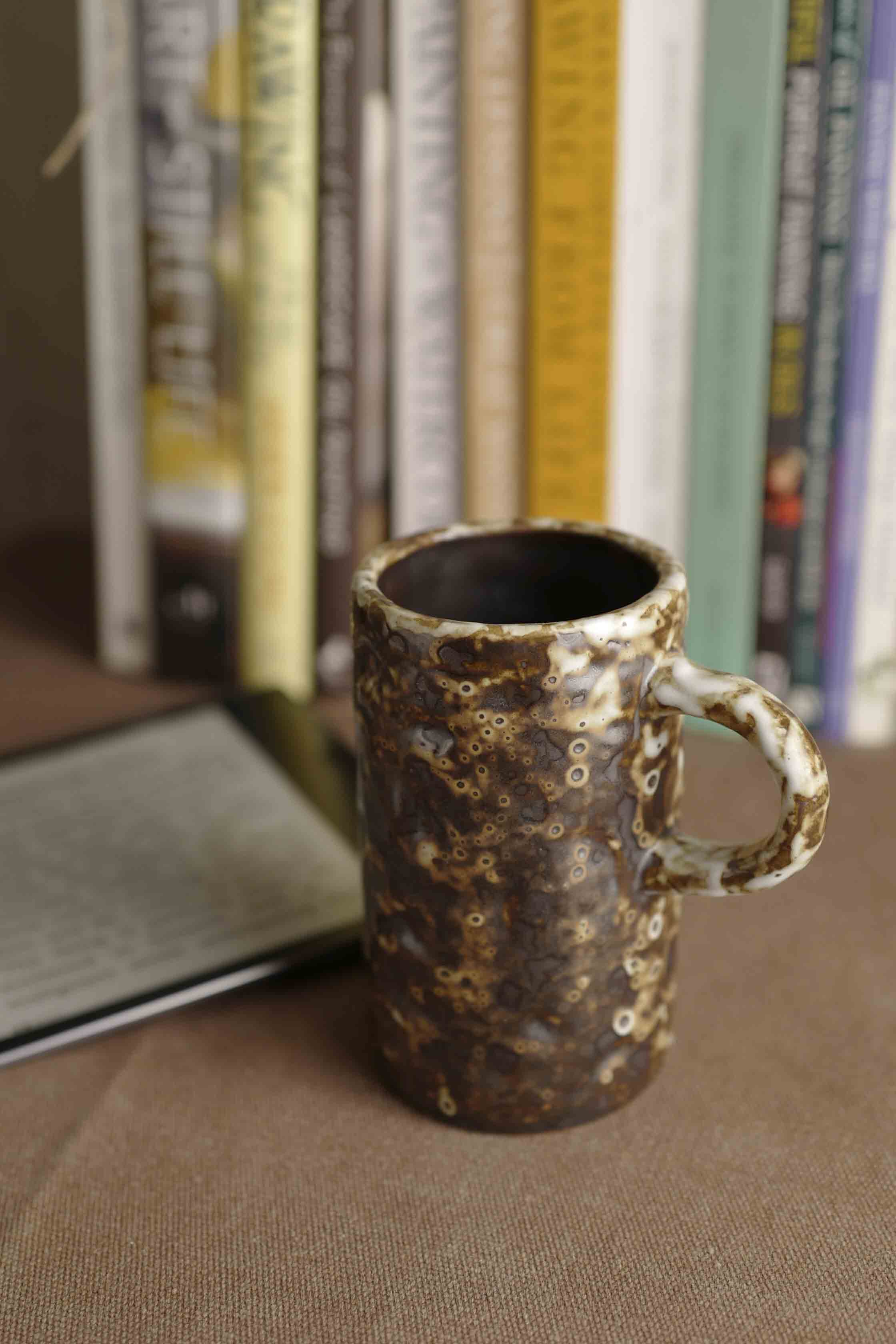 340 ml in size, 11.6cm height, dishwasher-safe. Color Brown and Cream White. Stoneware texture with an irregular but silky surface.